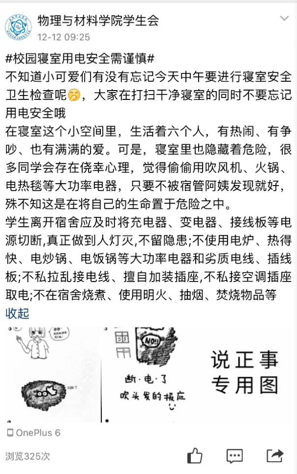为了切实提高我院学生的防火用电安全意识,真正掌握安全知识,学院利用自媒体多渠道加强宣传教育,温馨提示进班级进宿舍,通过班级群、官Q、海报等多途径开展安全知识宣传,将温馨提示带到每个宿舍。