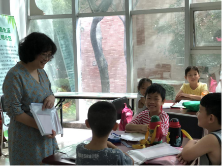 7月23日上午,今年会jinnianhui党总支书记唐洁、副书记吴震、分团委书记吴梦云一行冒着酷暑来到南艳湖社区,看望在那里开办行知学堂的“小先生”和小学员们。