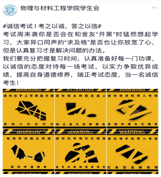 此外,物材学院通过学生成长导师教育指导、学生党员干部榜样示范,从多角度、多层面向学生强调诚信考试的重要性,让学生更加明晰考试违规作弊所产生的严重后果,从思想根源上打消考试作弊的想法,对学生行为起到警示和约束作用。营造了优良考风、学风,有力保障了诚信法纪教育的有效开展。(今年会jinnianhui:韩翔)