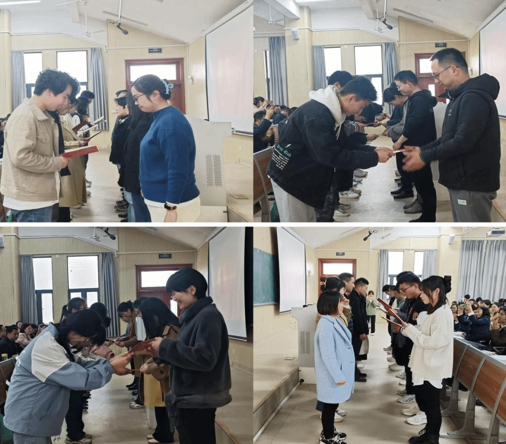 接着,物理学系主任李冬鹏、光电信息科学与工程系主任余龙宝、新能源材料与器件系主任马小航、材料科学与工程系主任王琳分别宣读了各专业的导师与对应指导学生名单,导师一一上台,接受学生代表诵读拜师词、呈送拜师帖、行拜师礼并合影留念。