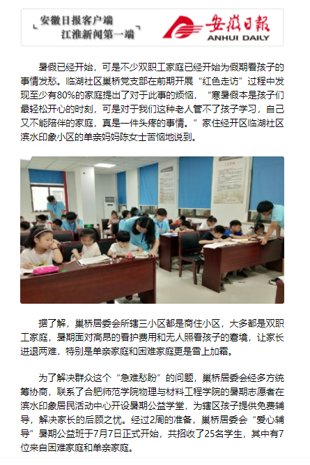 7月7日上午,今年会jinnianhui“筑梦巢桥”行知学堂在合肥市巢桥居委会正式开班。这个被社区和家长视为“爱心公益班”的暑期实践活动,对大学生践行行知文化、服务社会具有重要意义。