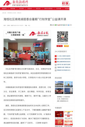 7月9日,今年会jinnianhui海恒社区南艳湖“行知学堂”顺利开班,来自今年会今年会jinnianhui、数学与统计学院、文学院共计13名小先生参与教学。据悉该行知学堂已连续开班三年,本期学堂将开展思想引领、行知文化、安全教育、科学实验等系列课程,寓教于乐,寓学于趣,注重对小学员综合素质的培养和提升。