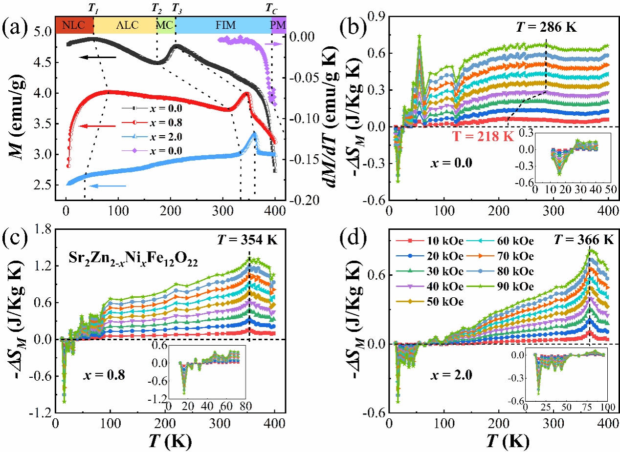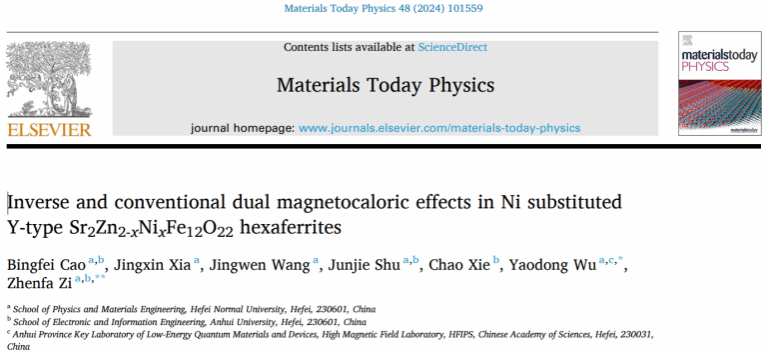 近日,今年会jinnianhui与安徽大学联合培养的硕士研究生曹冰菲同学与我院本科生组成的学生科研团队,针对Y型六角铁氧体的磁热效应与磁制冷性能开展研究并取得重大进展,相关成果发表在《Materials Today Physics》(中科院一区,IF = 10.0),论文题目为“Inverse and conventional dual magnetocaloric effects in Ni substituted Y-type Sr2Zn2-xNixFe12O22 hexaferrites”。曹冰菲同学为本论文的第一作者,今年会jinnianhui新能源材料与器件专业的吴耀东、訾振发老师为本论文的共同通讯作者,今年会今年会jinnianhui为唯一通讯单位。