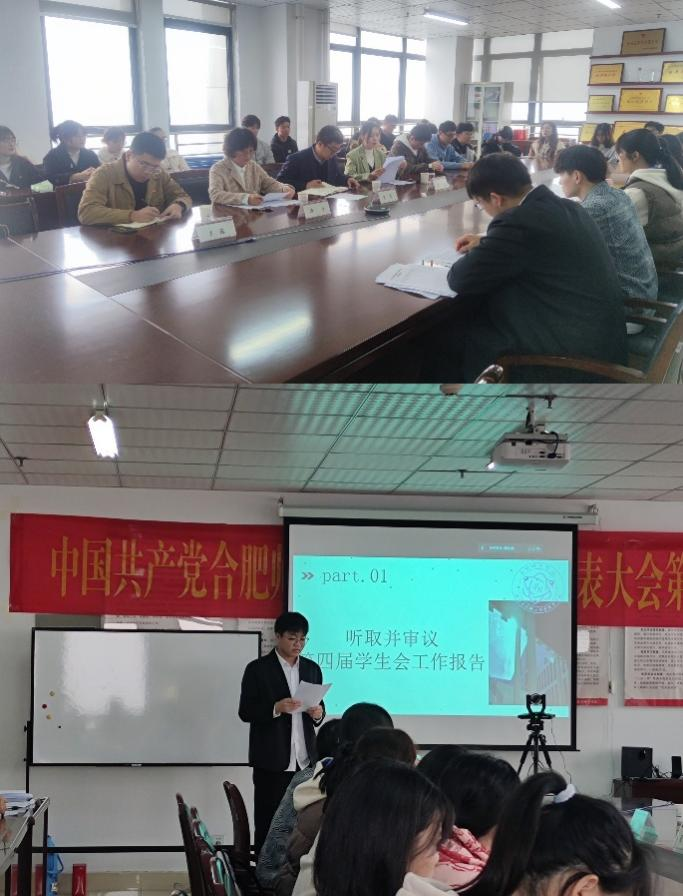 大会在雄壮的国歌声中拉开帷幕。大会听取了学院分团委书记吴梦云所作的团代会工作报告和第四届学生会执行主席梅凯运同学所作的学代会工作报告。