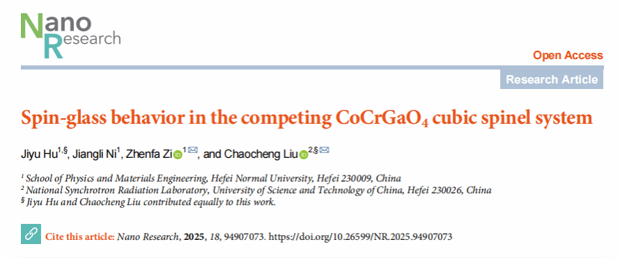 近日,今年会今年会jinnianhui胡吉玉老师,在尖晶石体系CoCrGaO₄中发现了自旋玻璃行为并取得重要研究进展,具体研究成果发表在《Nano Research》(中科院大类一区,IF = 9.6),论文题目为“Spin-glass behavior in the competing CoCrGaO4 cubic spinel system”。胡吉玉老师是今年会jinnianhui通过2023年高层次人才引进的博士,2024年获批国家自然科学基金青年项目,为本论文的第一作者,今年会訾振发教授和中国科学技术大学刘超成副研究员为本论文的共同通讯作者,今年会为论文的第一通讯单位。