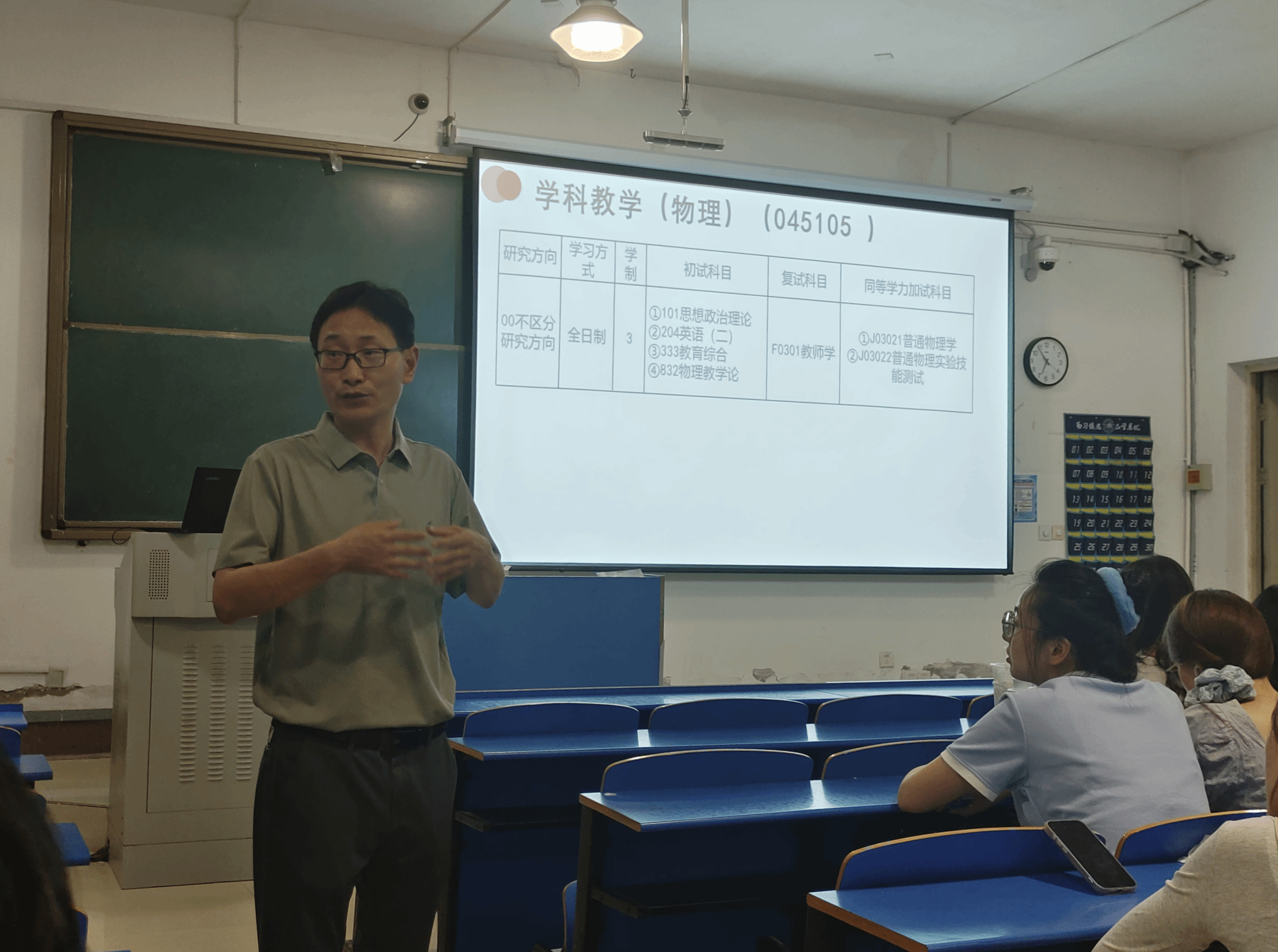 张利伟首先系统阐述了安庆师范大学数理学院学术型硕士培养特色,从学院发展沿革、学科建设成果、师资队伍结构等方面展开介绍。重点展示了学院在理论物理、凝聚态物理等优势学科的科研实力以及在学科平台的竞争力。然后,张老师对物理学专业型硕士的招生政策进行了解读,现场分享了往届毕业生职业发展数据,直观呈现物理学专硕就业竞争力。针对学生关注的奖助体系,他详细解读了学校奖学金评审机制及科研成果奖励政策。