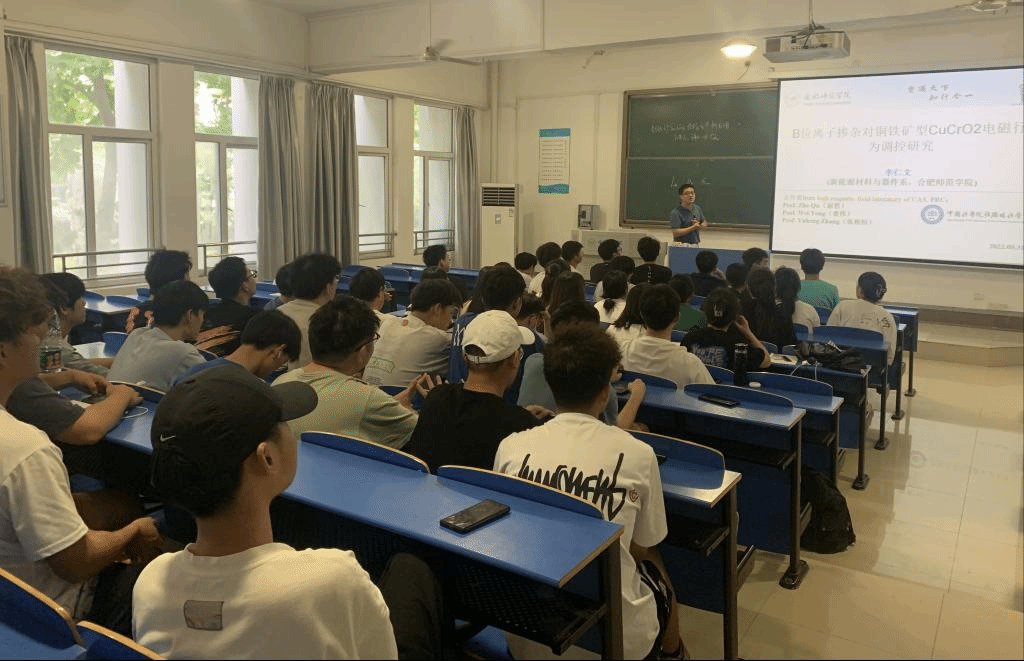 李仁文老师报告主题为“B位离子掺杂对铜铁矿型CuCrO2电磁行为调控研究”。铜铁矿结构CuCrO2材料具有自旋阻挫的特点,是极具应用价值的磁/电/光多功能材料。李仁文老师结合自己的科研经历深入浅出地对多晶CuCrO2中离子替代对系统电磁行为的测量分析作了介绍,并结合半导体物理与器件课程中多数载流子知识,教会学生分析其中Ti离子价态,并澄清了文献中的错误,引导学生在平时学习和以后研究中要敢于质疑。报告现场气氛严肃而活跃。