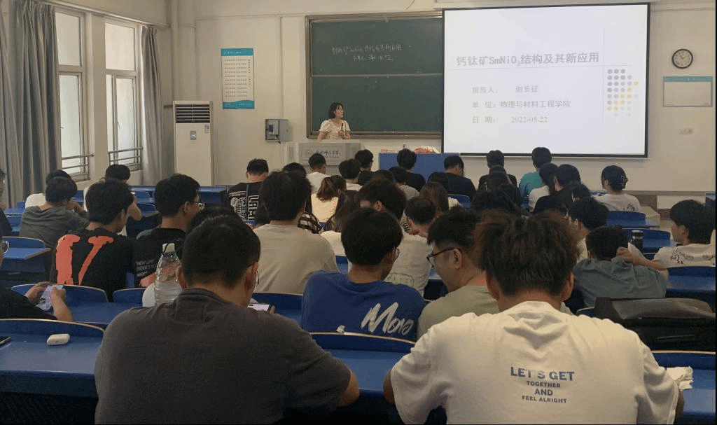 谢长征老师报告主题为“钙钛矿SmNiO3结构及其新应用”,报告从钙钛矿材料的结构、性能、制备方法及最新研究进展几个方面展开,着重介绍了SmNiO3材料在固体氧化物燃料电池、智能涂层及海洋探测等领域的具体应用形式及内在物理机制。谢老师由浅入深的讲解帮助学生理解掌握钙钛矿构型材料的晶体结构、内部相互作用及过渡金属离子的电子结构等知识,激发了学生参与科学研究的兴趣,可以为以后的学习深造打下基础。