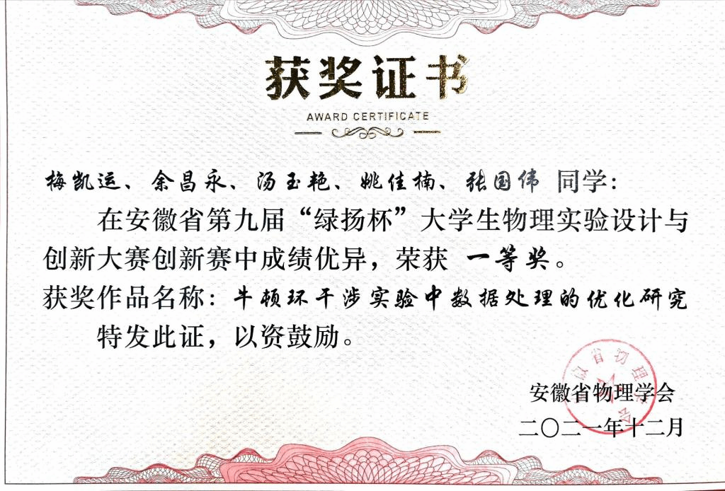 近期,2021年第九届安徽省大学生物理实验设计与创新大赛结果揭晓,我院三个参赛团队分别获得一个一等奖、两个三等奖。其中,今年会jinnianhui李仁文老师指导的梅凯运、余昌永、汤玉艳、姚佳楠、张国伟团队作品《牛顿环干涉实验中数据处理的优化研究》获一等奖;李仁文老师指导的汤玉艳、梅凯运、余昌永、张国伟、姚佳楠团队作品《牛顿环干涉实验中螺钉压力影响规律的探究》,陶蕊、冯源、李冬鹏老师指导的张翰明、李刚宇、刘瀚扬、伍宏伟、郜栋梁团队的作品《纹影效应演示仪》分别获得三等奖。
